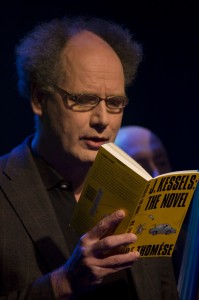 ‘Nee, ik probeer geen performer te worden. Ik wil gewoon goed voorlezen. Als je gelooft in je eigen werk lees je goed voor. Vroeger lag het me nooit zo, dan moest ik weer voor zo’n bibliotheekkring naar een dorp, kopje koffie, al die vragen en knikkende mensen, en dan na die verschrikking de stoptrein terug, de smaak van zo’n avond wegspoelend met wat blikjes bier die ik op de heenreis al vast had ingeslagen. Eigenlijk pas sinds ik ten tijde van Schaduwkind met Hugo Claus en Dimitri Verhulst op tournee langs de Vlaamse theaters was met het programma Saint Amour kreeg ik er plezier in. Ik heb ook gekeken hoe zij dat deden, maar die Belgen zijn er gewoon beter in. Die schuwen het grote gebaar niet. Bij ons heeft dat al snel iets aanstellerigs he. Wij kennen dat toch ook niet, die echte literaire performers. Niet sinds Johnny the Selfkicker in ieder geval. Of ik uit Schaduwkind voordraag of uit J. Kessels: The Novel maakt in wezen ook niks uit. Je hebt het zelf geschreven, en niet zonder reden. Het enige dat telt is dat je er in gelóóft’.