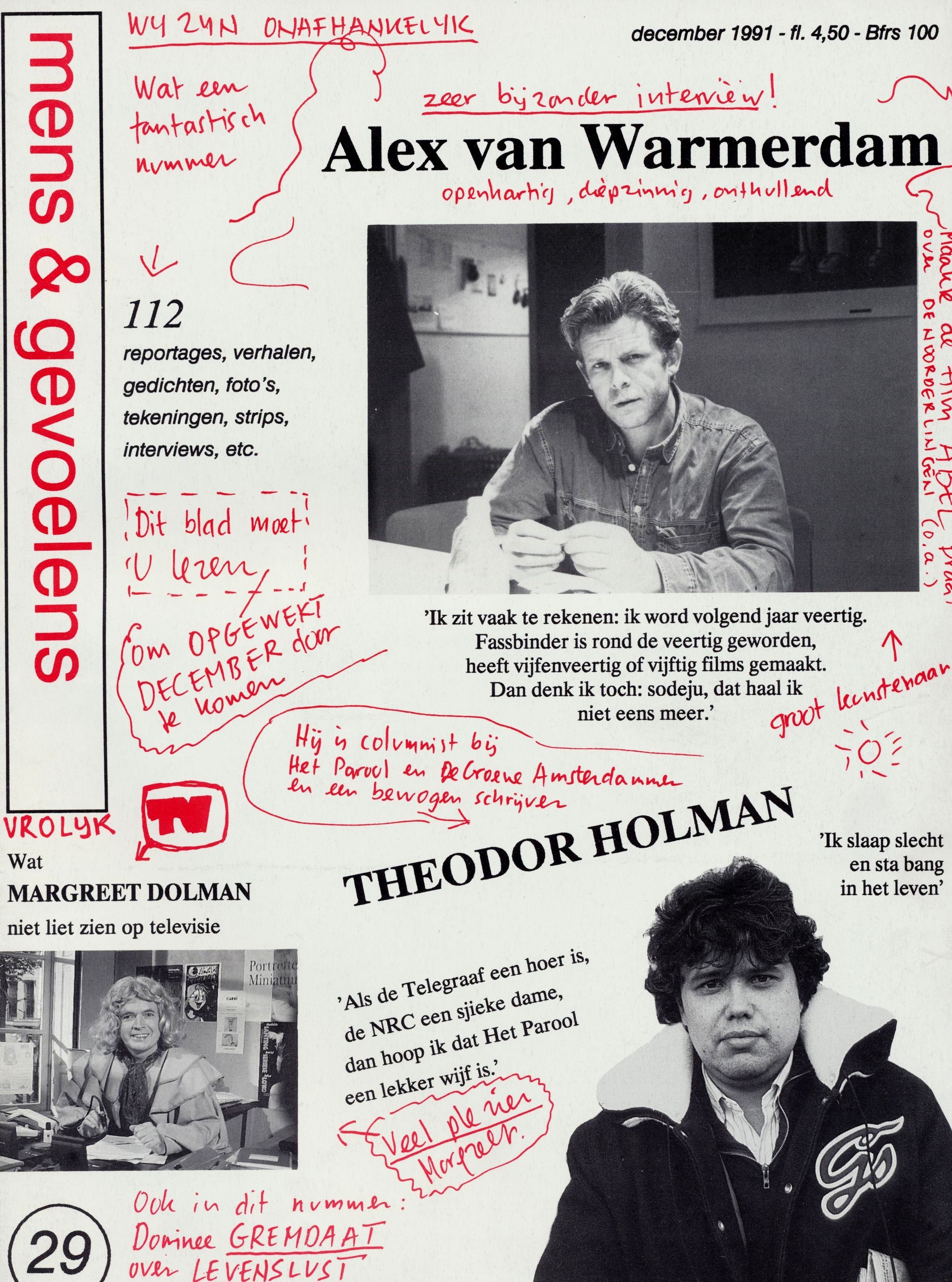 Theodor Holman: ‘Ik slaap slecht en sta bang in het leven – doodsangst. En doodsangst is levensangst. Ik ben een tijd echt fobisch geweest. Dacht constant dat ik plotseling een hartaanval zou krijgen. Het daadwerkelijke moment waarop mijn dochter geboren is, is dat verschoven. Ze is twee minuten oud, de dokter zegt: ‘Pak haar maar…