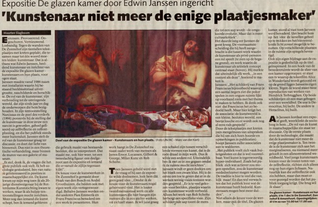 Eenzaam. Provocerend. Ongeschoren. Vernieuwend. Losbandig. Tegen de wanden van De Zonnehof zijn tientallen tekstplaatjes met kreten geplakt, die tezamen maar tot één woord moeten leiden: kunstenaar. Dat is althans wat Edwin Janssen, beeldend kunstenaar en inrichter van de expositie De glazen kamer – kunstenaars en hun plaats, voor ogen staat.