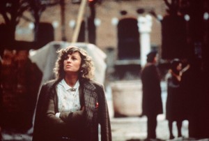 Eros en Thanatos, psychoanalytici zouden er wel raad mee weten. Het is ook precies de thematiek waarmee Lars von Trier speelt in zijn film Antichrist (2009). Von Trier laat het zoontje van het echtpaar een onfortuinlijke val uit het raam maken juist als zijn ouders de liefde bedrijven en even geen acht slaan op hun kind. Antichrist begint direct met de echtelijke seks, maar anders dan in Don’t Look Now vervreemdt de regisseur de kijker hier direct van wat hij ziet door de gedragen klanken van Händels aria Lascia chi’io pange. Bij Roeg weerklinkt tijdens de liefdesscène hetzelfde lieflijke muzikale thema als bij de omineuze openingsscène bij de vijver in de tuin, nu niet langer alleen op de piano maar aangevuld met fluit en akoestische gitaar. Een zwaar aangezette orkestrale versie werd door Roeg weggegooid, en gelukkig maar: het laatste wat we hier nodig hebben is pathos. Later in de film, in de slotscène, ligt dat anders. Ook dan weerklinkt het thema, vermengd met hard luidende kerkklokken. John wordt vermoord, maar in de ogen van zijn vrouw is hij herenigd met z’n dochter. Laura’s serene, haast gelukzalige blik bij de begrafenis moet dat onderstrepen.