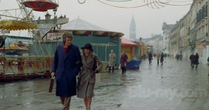 Het is maar hoe je er naar kijkt, maar het is waar: Don’t Look Now laat Venetië niet zien van haar zonnige, toeristische kant. De film werd gedraaid in de winter en toont ons een duistere, mysterieuze stad die altijd gehuld is in mist. Natte muren met mos, afbrokkelend pleisterwerk, sinistere, vochtige steegjes, opvliegende duiven, kattengejank, en overal en altijd reflecties in water. Een van de vreemde dingen in Venetië is dat je vaak andere mensen hoort als je door de stad wandelt, zonder ze te zien, merkte Roeg eerder op. ‘Venice is like a city in aspic,’ laat hij de helderziende zus zeggen, ‘dat zegt mijn zus. Ze haat het. Het doet haar denken aan het moment na afloop van een dinerfeestje, als alle gasten weg zijn… Te veel schaduwen.’