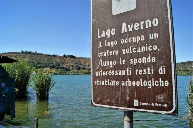 Als we aan de oever staan strekt zich voor ons een diepblauw kratermeer uit. Eendjes dobberen in het water, vogels scheren rakelings over het oppervlak. Volgens de legende is dit de plek waar Odysseus de afdaling naar de onderwereld maakte, net als overigens de Trojaanse held Aeneas volgens Vergilius. Maar niets refereert daar hier aan. Vogels die indertijd over het meer vlogen vielen pardoes dood neer. Er is veel verbeelding nodig om in deze lieflijke locatie de hel te zien, maar vandaag hebben wij die verbeelding.